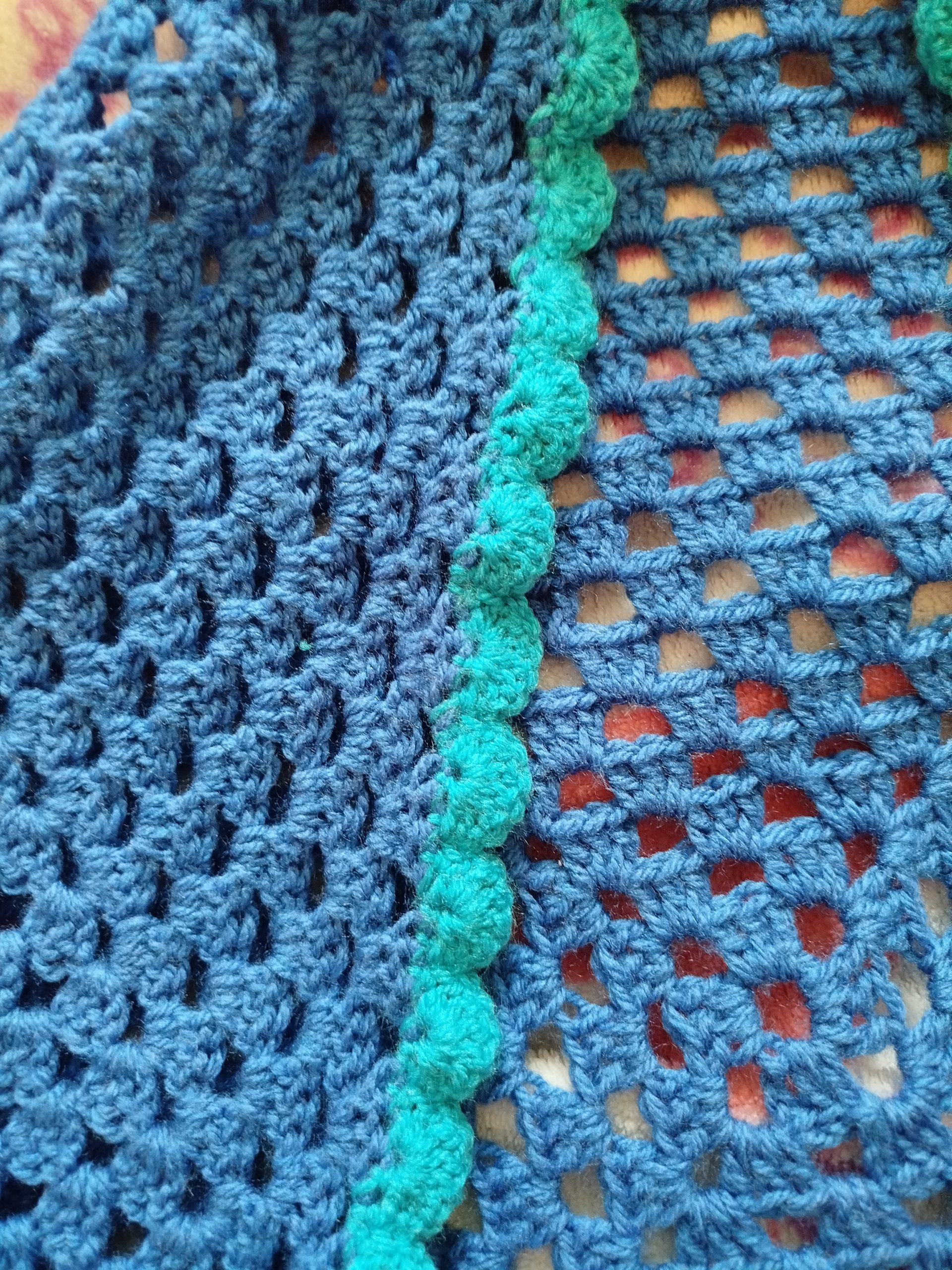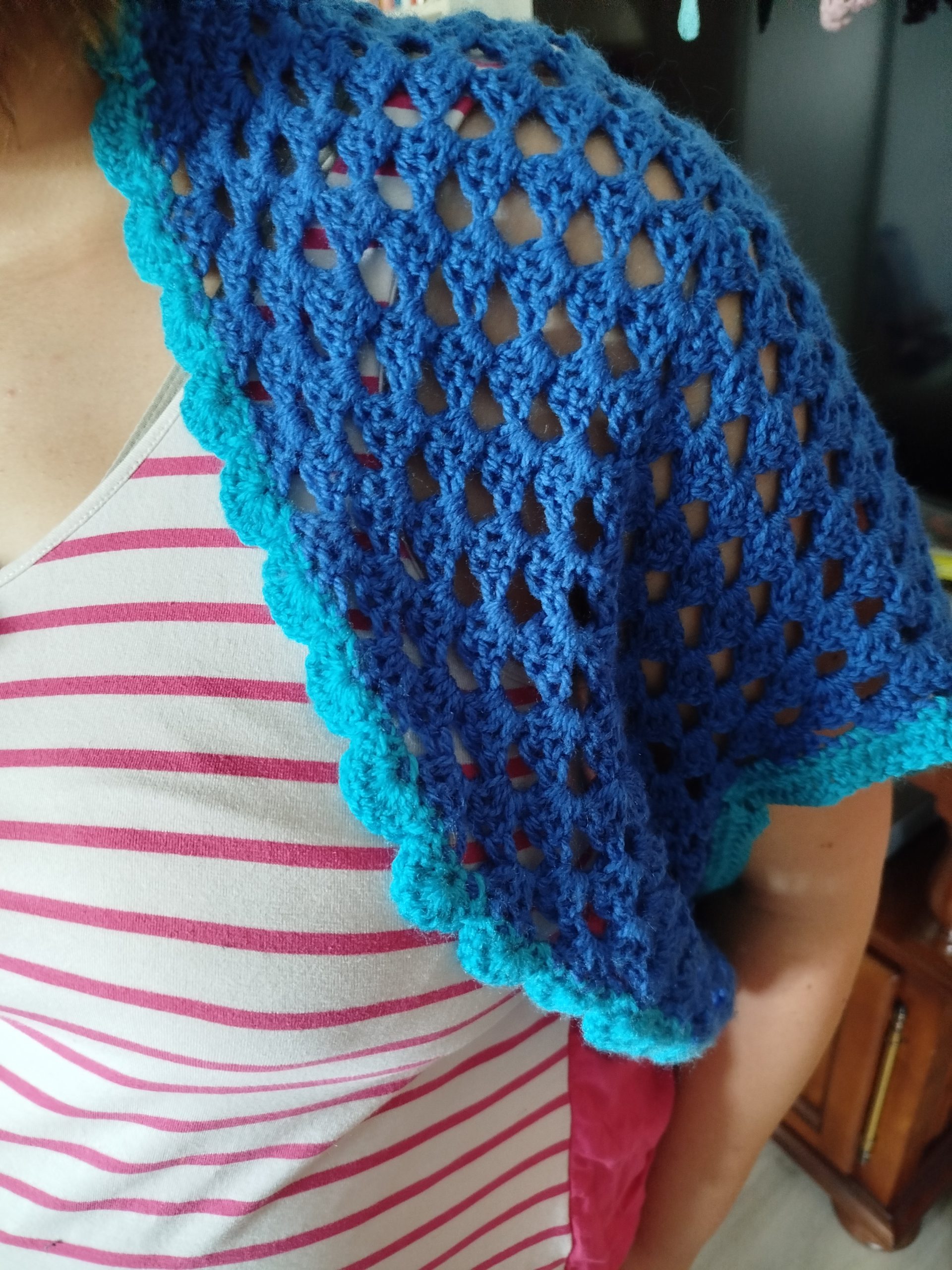 ce gilet cozy en fil acrylique à deux tons de bleu apporte une touche féminine et apaisante à votre tenue.